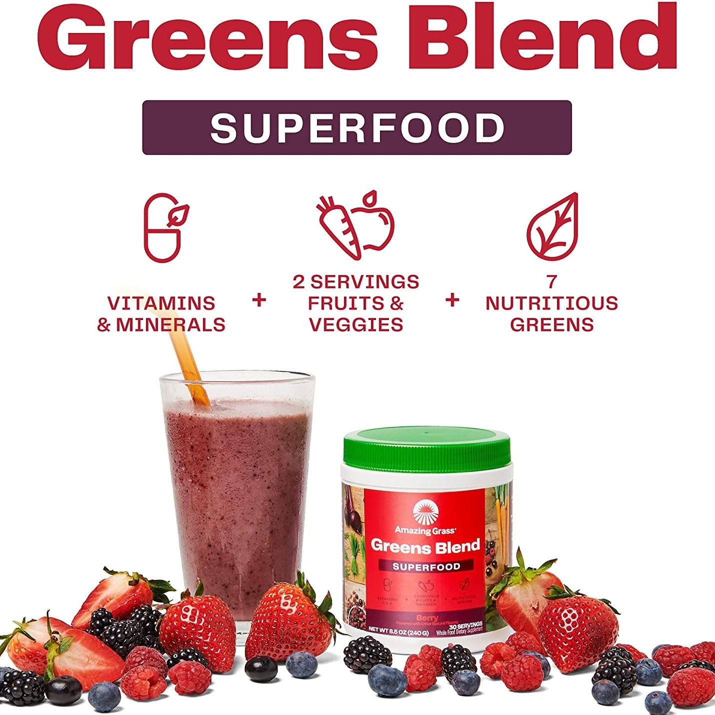 Super Greens Powder with Spirulina, Chlorella, Beet Root Powder, Digestive Enzymes & Probiotics, Berry, 60 Servings